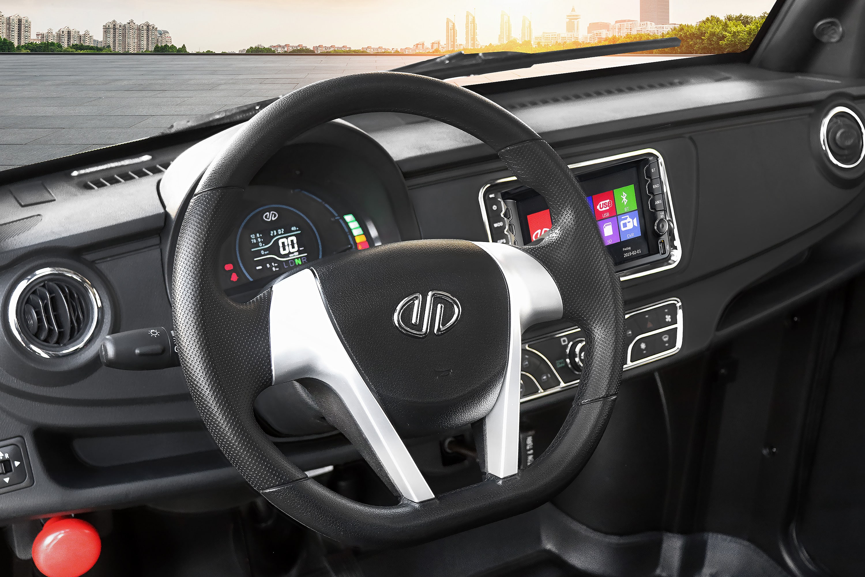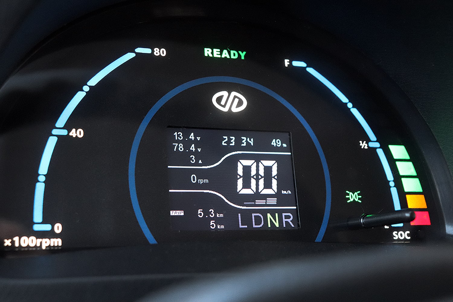 Het digitale display op de console geeft essentiële voertuiggegevens weer, zoals de snelheid, het batterijniveau en rij-informatie. Deze informatie is duidelijk zichtbaar en gemakkelijk af te lezen, waardoor de bestuurder altijd op de hoogte is van de staat van het voertuig, zelfs tijdens uitdagende rijomstandigheden.