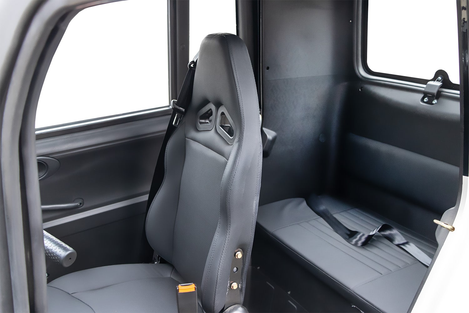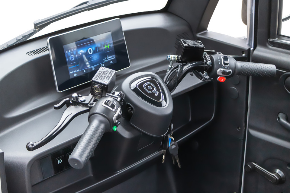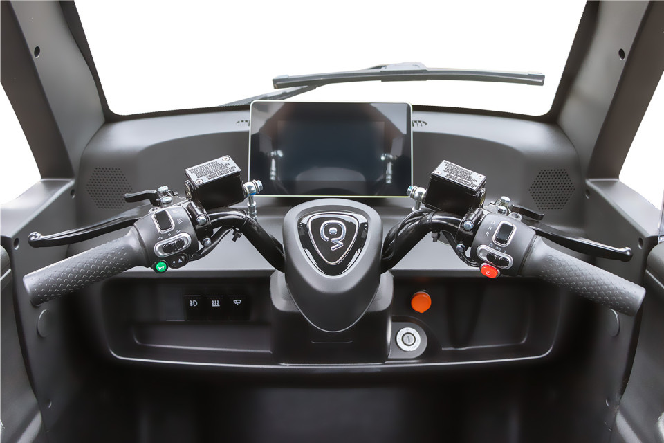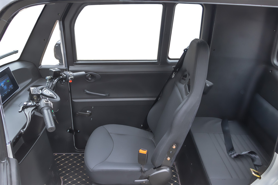 De strakke afwerking van het interieur met zwart kunststof geeft een moderne uitstraling, terwijl de stijlvolle vloermat extra grip en netheid biedt. Grote zijramen zorgen voor voldoende lichtinval, wat het ruimtelijke gevoel in de cabine vergroot. Dit functionele en comfortabele ontwerp is perfect afgestemd op het stedelijk gebruik van de brommobiel.