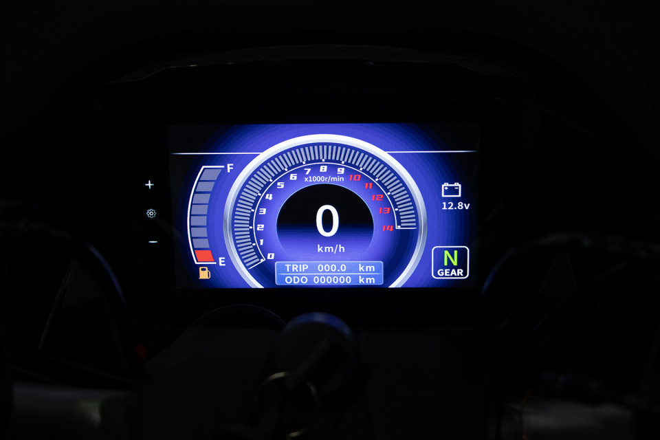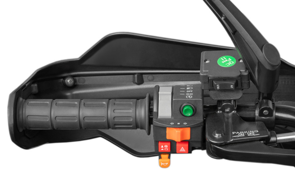 Het voertuig is uitgerust met een overzichtelijk stuur dat speciaal is ontworpen voor comfort en gemakkelijke bediening. Aan beide kanten van het stuur bevinden zich handgrepen met een stevige grip, voorzien van hydraulische remhendels voor maximale controle en veiligheid tijdens het rijden.